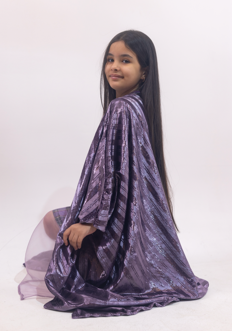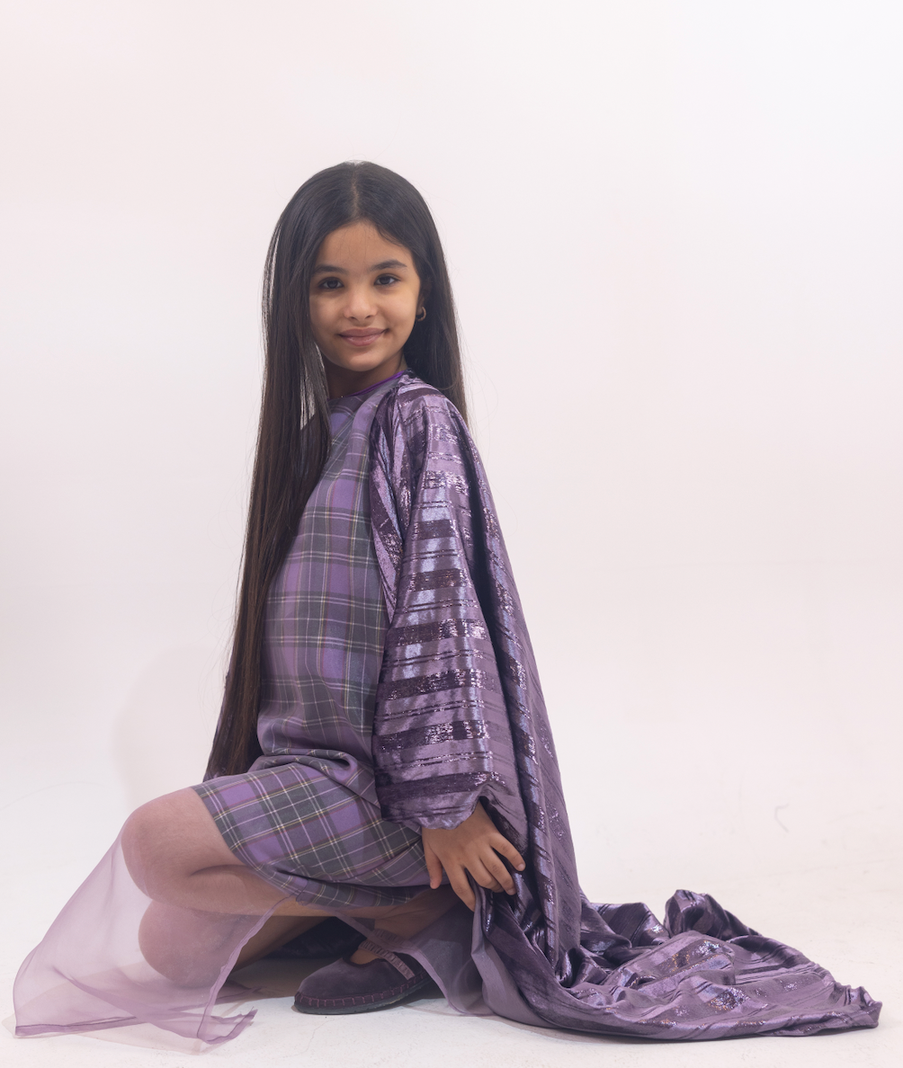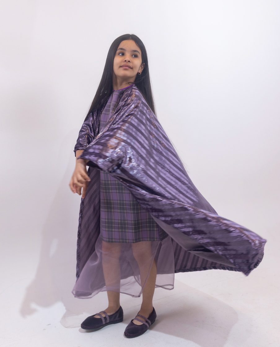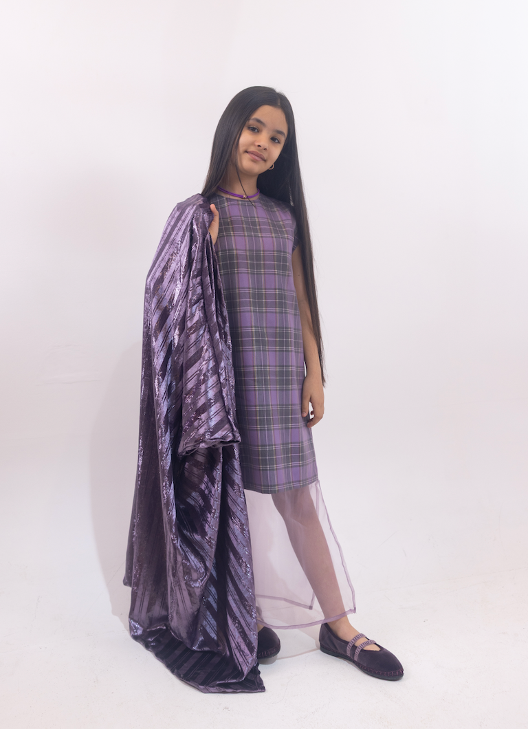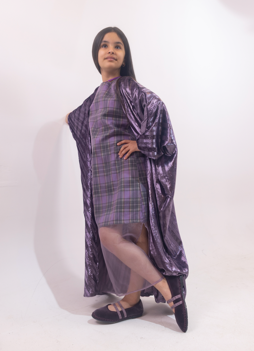 A playful plaid mini silhouette layered under a delicate lilac organza overlay, finished with a luminous striped iris bisht for a chic, layered look.