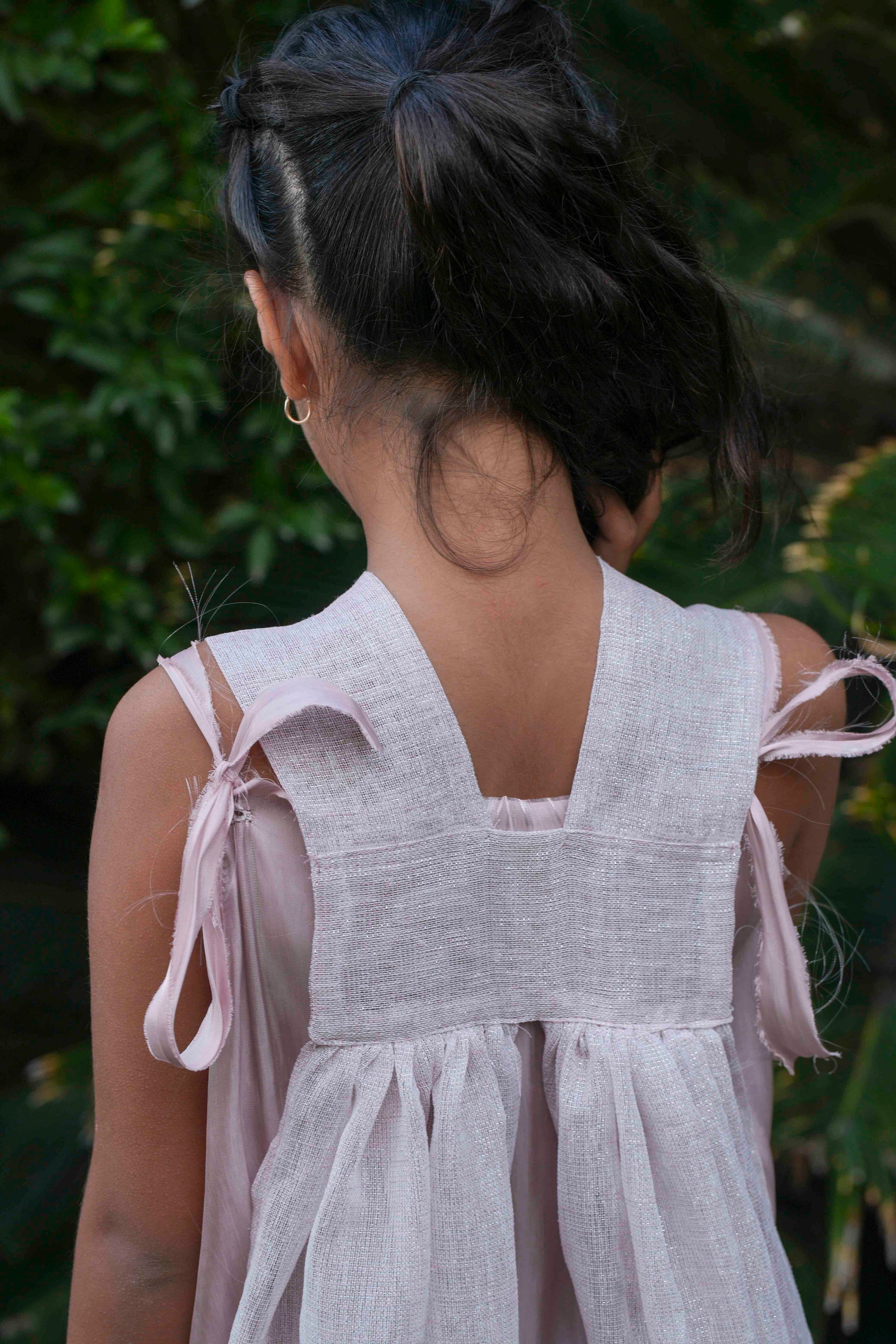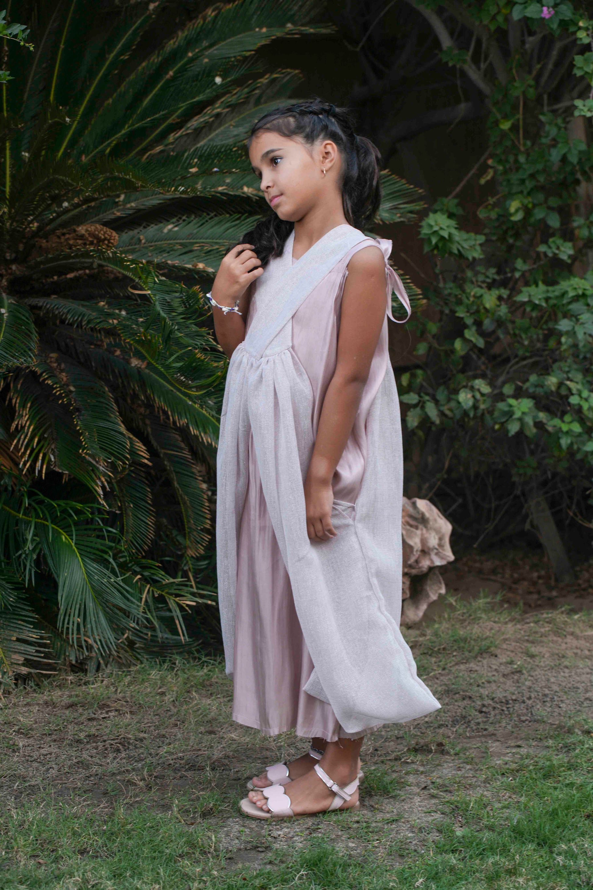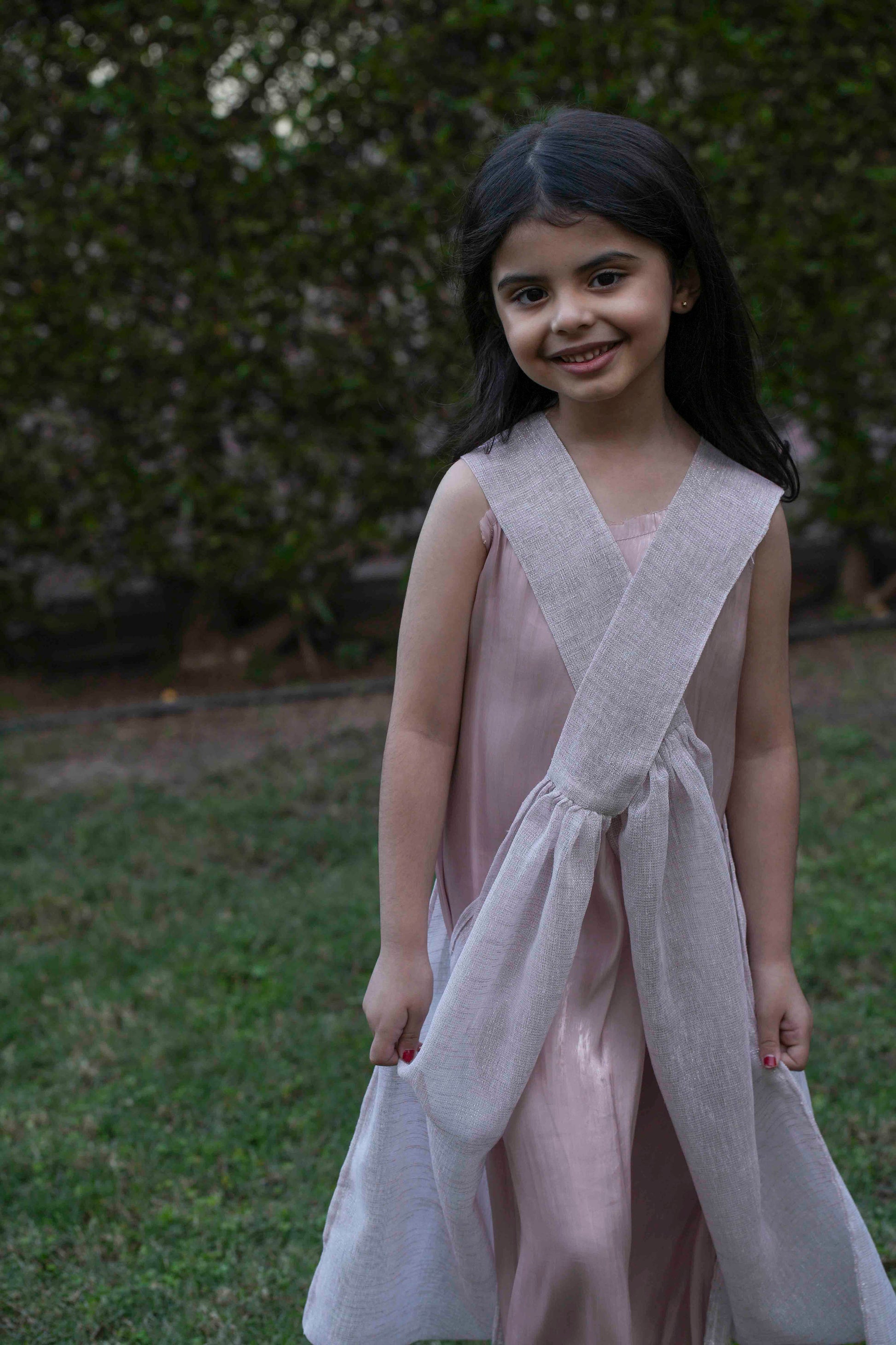 SPARKLY PINK ADJUSTABLE SLIP DRESS WITH A WOVEN CROSS-VEST OVERLAY
